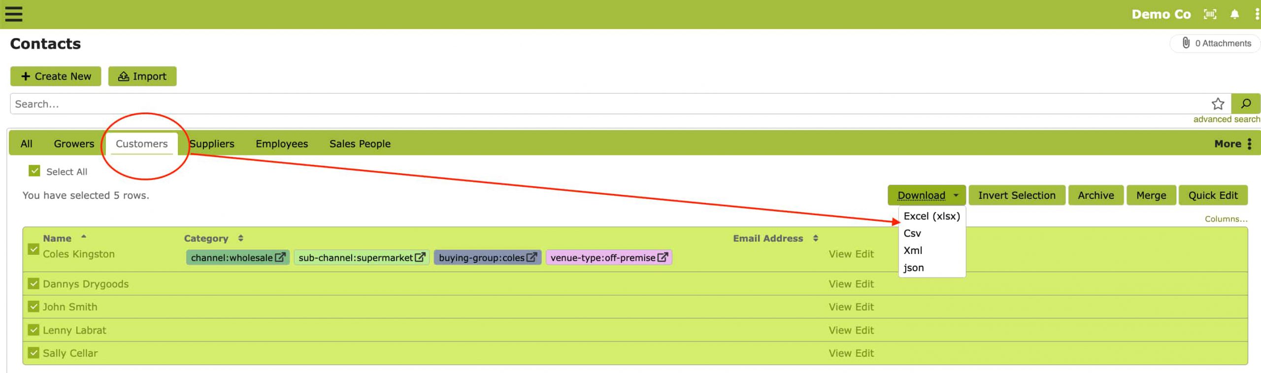 Once you have saved your example customers you can go back to Customers>Select all> Download Csv or Excel: