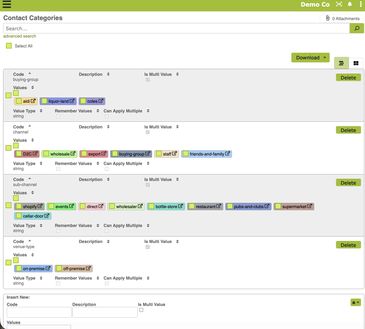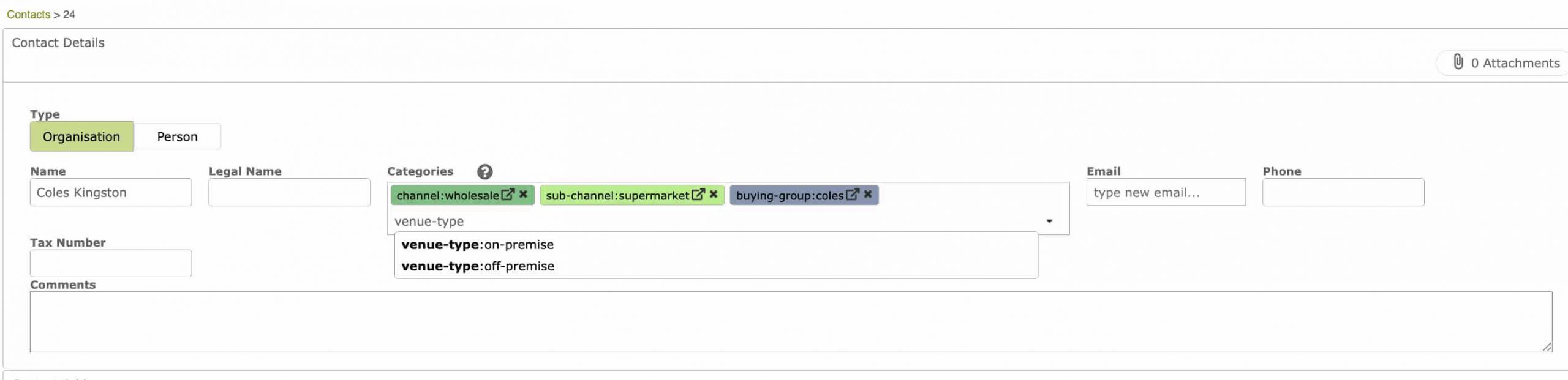 Note that the drop-down options to choose from are those that were typed in Settings. Also not all customers need all category types eg if they are not part of a buying group, then you don’t need a value for buying-group.