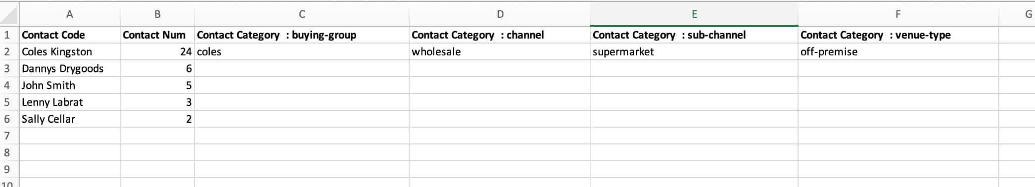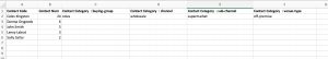 The idea is to split up these categories as much as possible to later make reporting flexible. For example you can start with a high legal category “Channel” this is your top level sales channel and you can break it down further through “sub-channel”. Others like “venue-type” and “buying-group” (if relevant) can also be separated.